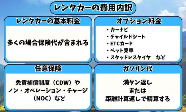 以下では、レンタカーの基本料金、オプション費用、保険料や、ガソリン代の特徴について紹介します。