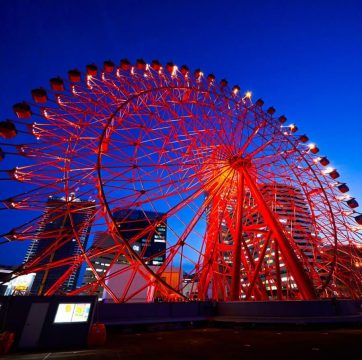 梅田駅近くにある赤い巨大な観覧車「HEP FIVE観覧車」は、地上106mから大阪の街並みを見渡せる定番の観光スポットです。