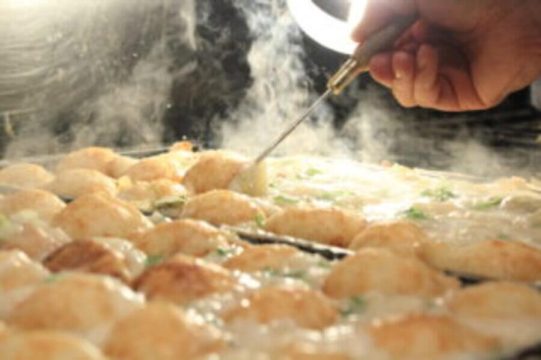 70年以上の歴史があり、こだわりの熱伝導を実現する特注の銅板で作られるたこ焼きは、カリッとした食感ながら中はトロッとして絶妙です。
